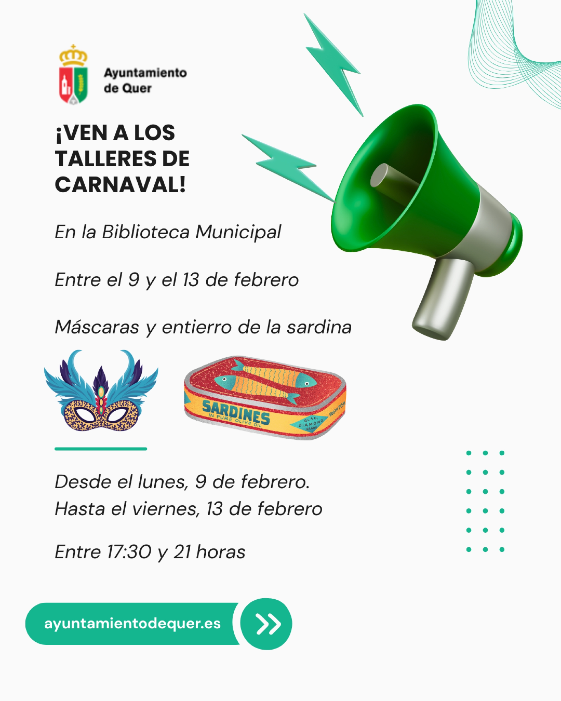 La Biblioteca Municipal de Quer, en colaboración con el AMPA del CEIP Villa de Quer, organiza talleres gratuitos para niños del municipio. Durante estas sesiones se elaborarán máscaras y elementos decorativos relacionados con el Carnaval y el Entierro de la Sardina.